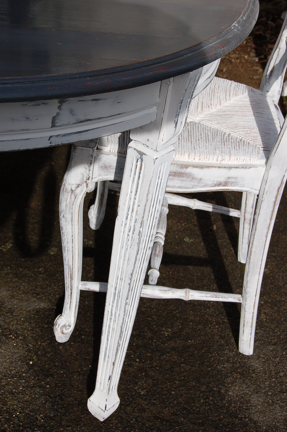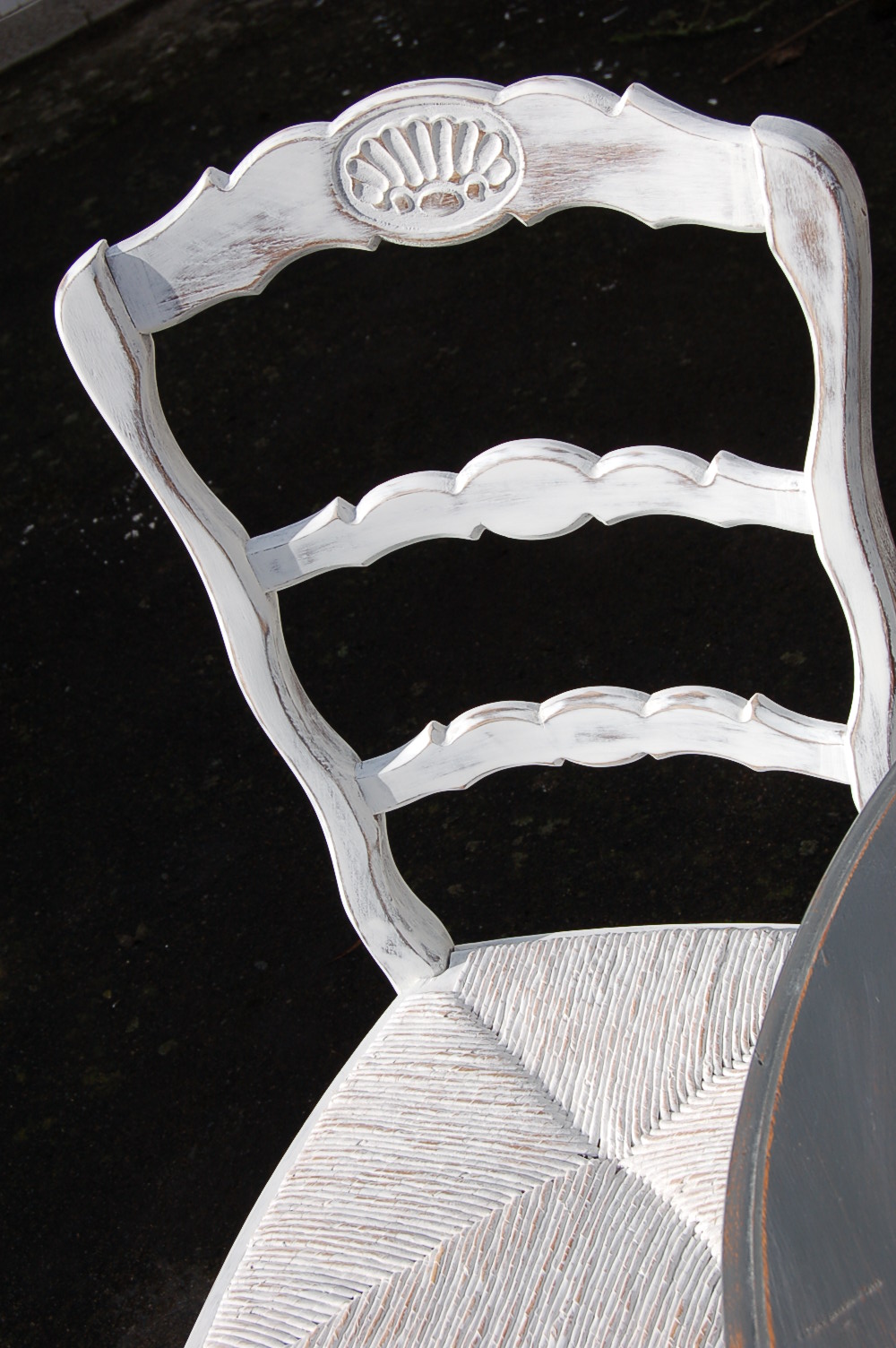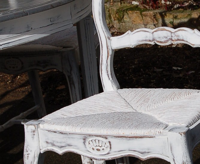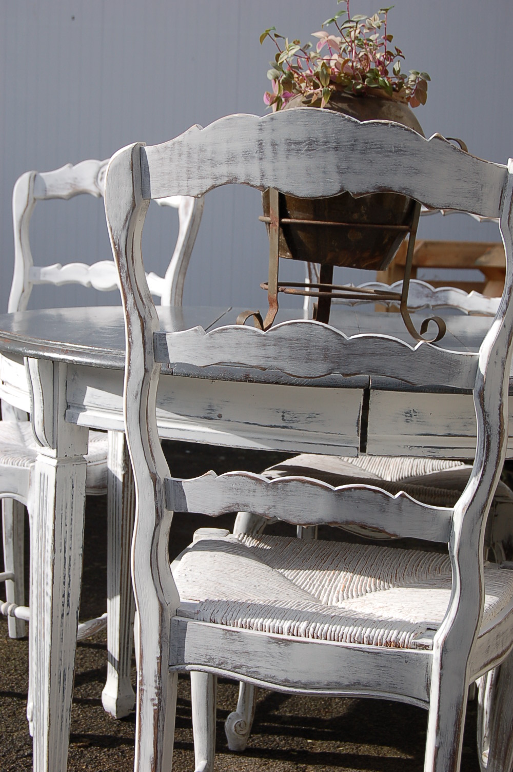Elle est accompagnée de quatre chaises patinées également en craie.
